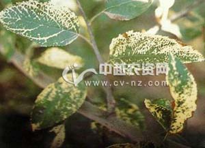 (二)果樹黃葉病是由于植物組織內(nèi)鐵的缺乏而造成的一種生理性病害。其癥狀是先從果樹新梢的頂端嫩葉開始變黃,越往枝節(jié)下端,老葉黃葉現(xiàn)象越輕。缺鐵輕微時(shí),葉片葉肉變黃,葉脈兩側(cè)仍為綠色,呈綠色網(wǎng)紋狀;缺鐵嚴(yán)重時(shí),葉片失綠加重,變成白色,并在失綠部分出現(xiàn)銹褐色枯斑或葉緣變得焦枯,引起落葉。